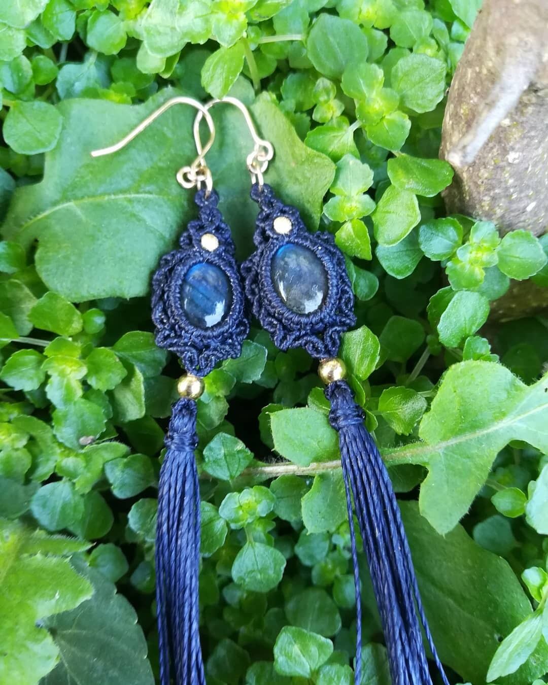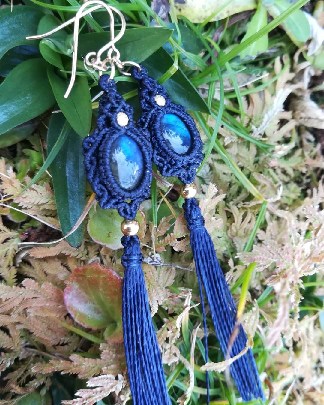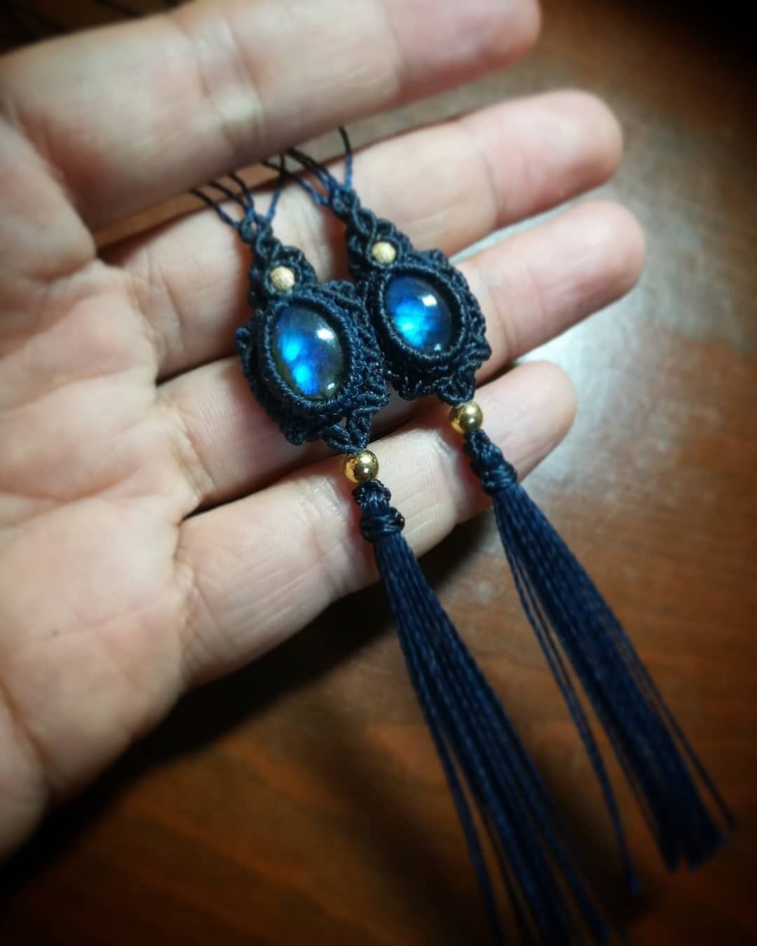 今回は、ブルーのシラーの美しいラブラドライトを紺色のコードでかっこよくタッセルピアスに編みました。14kのゴールドビーズが高級感を演出しています。