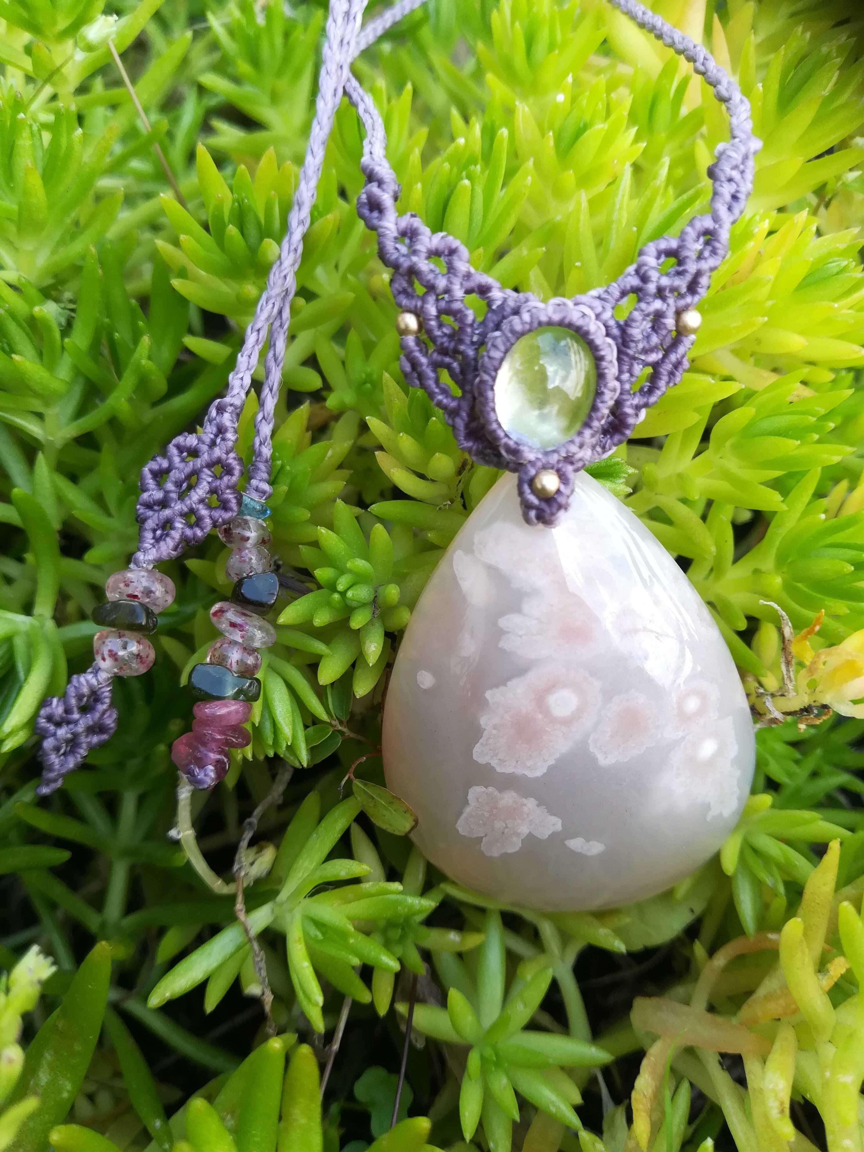 今回は、サンストーンと、ムーンストーンの2パターンのネックレスを編ませていただきました。どちらも、春らしい優しい雰囲気の心ときめく可愛らしいネックレスです。
