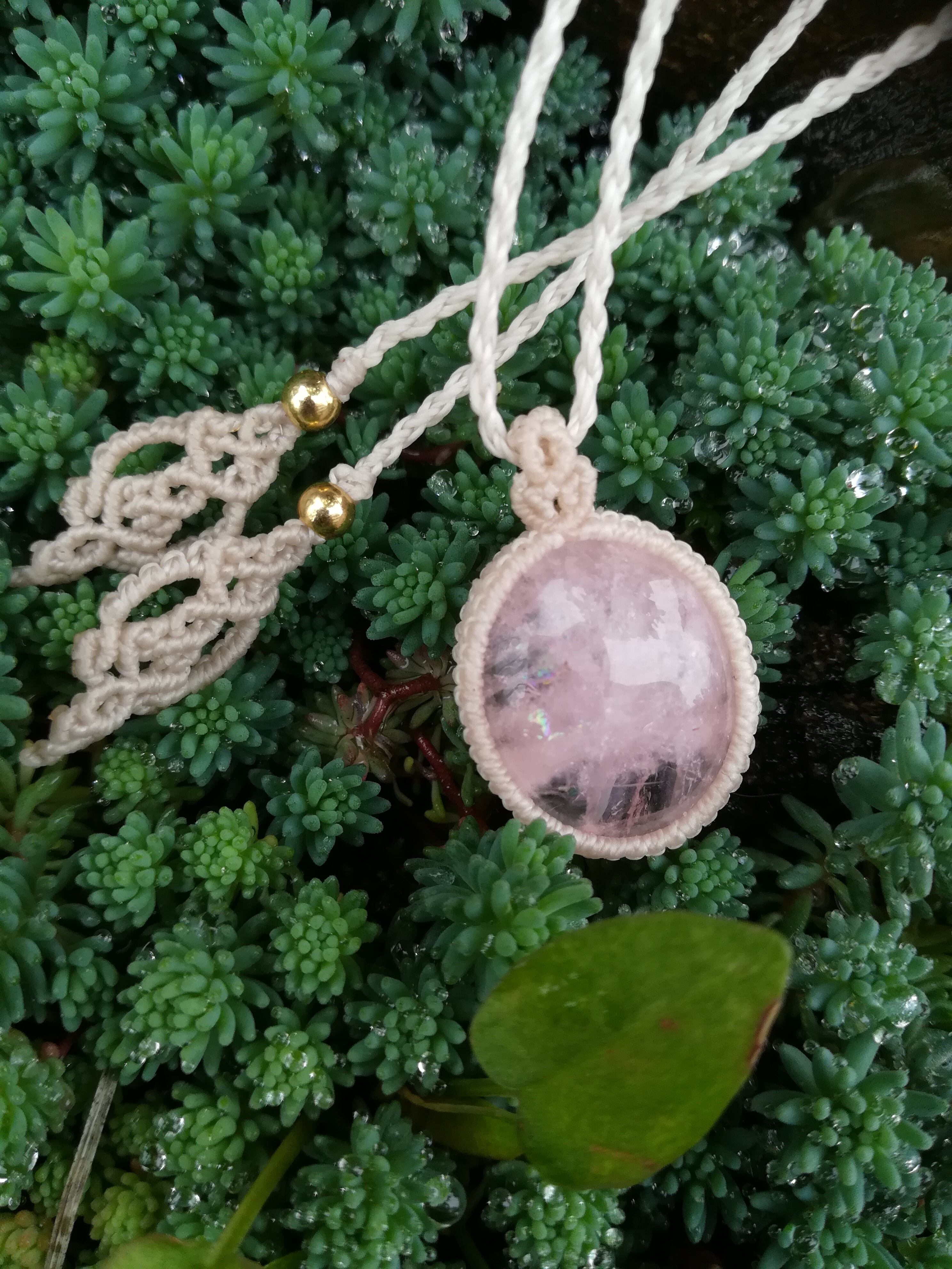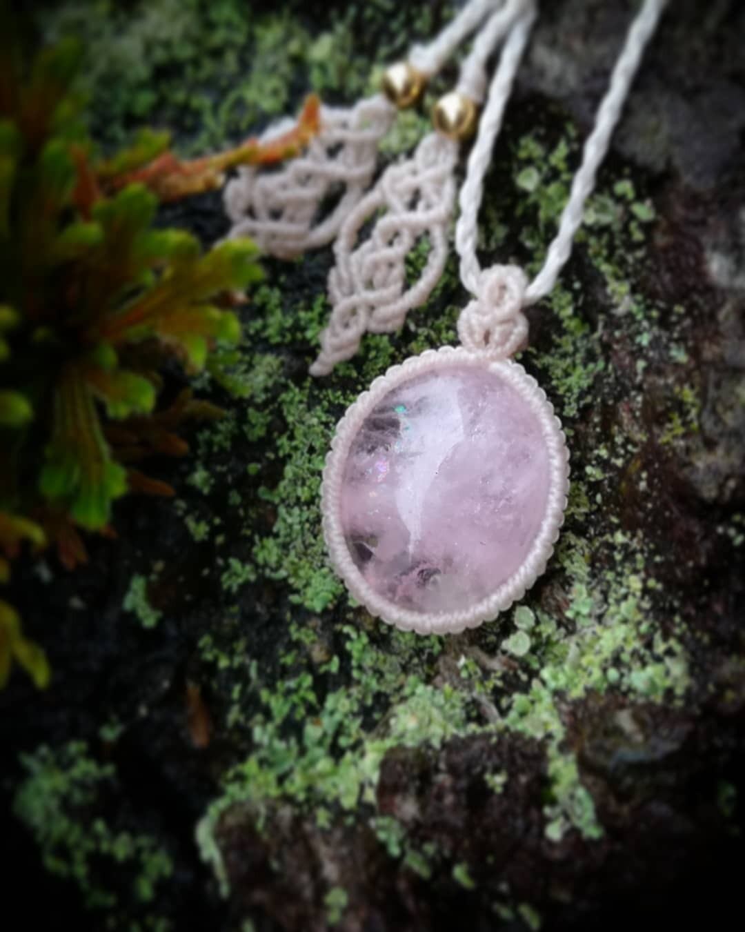 今回は透明度も高く虹入のピンク色の美しいモルガナイトをホワイトコードで可愛らしく編ませていただきました。写真ではわかりづらいですが、キラキラの虹がとても美しいです。