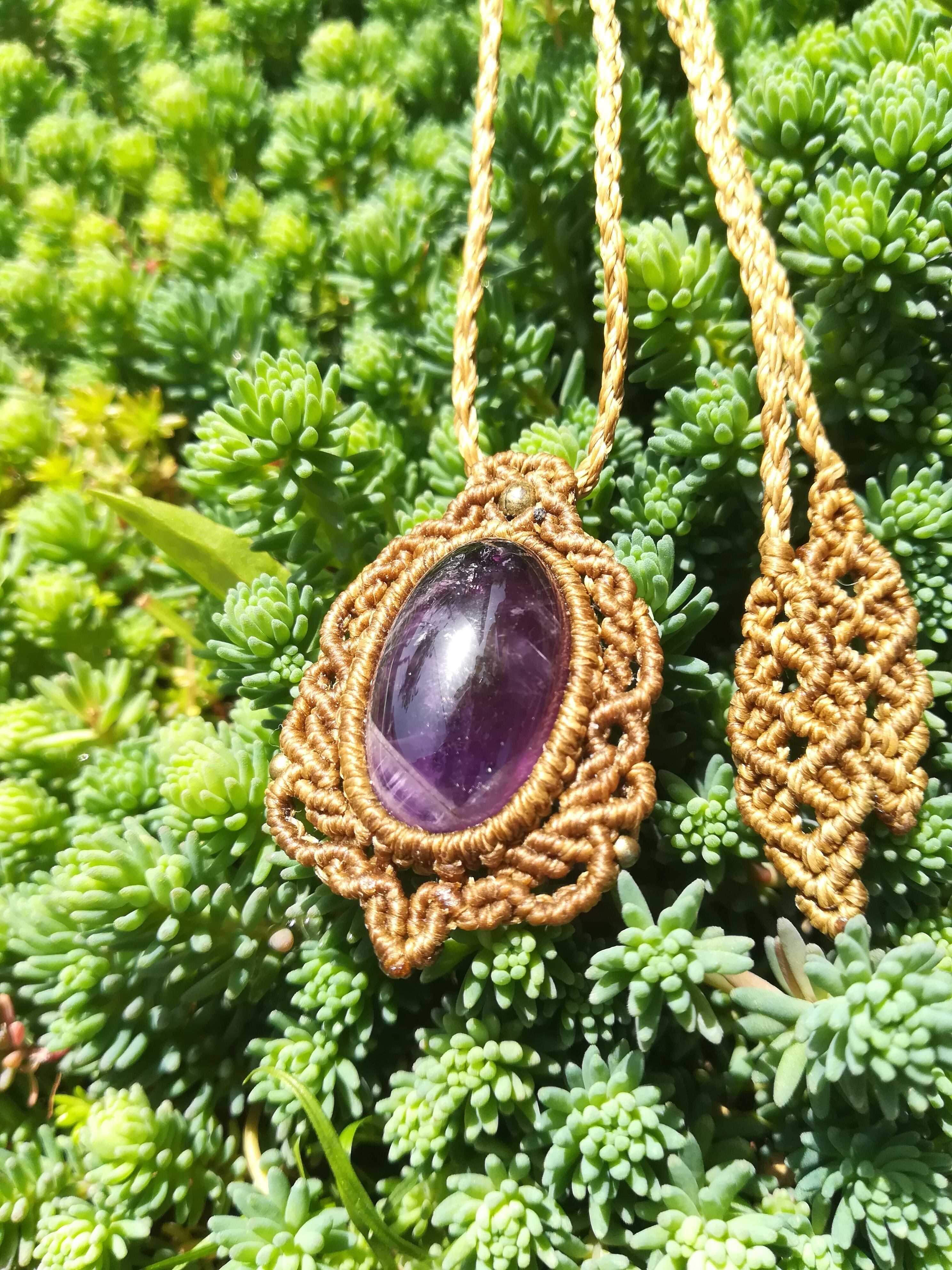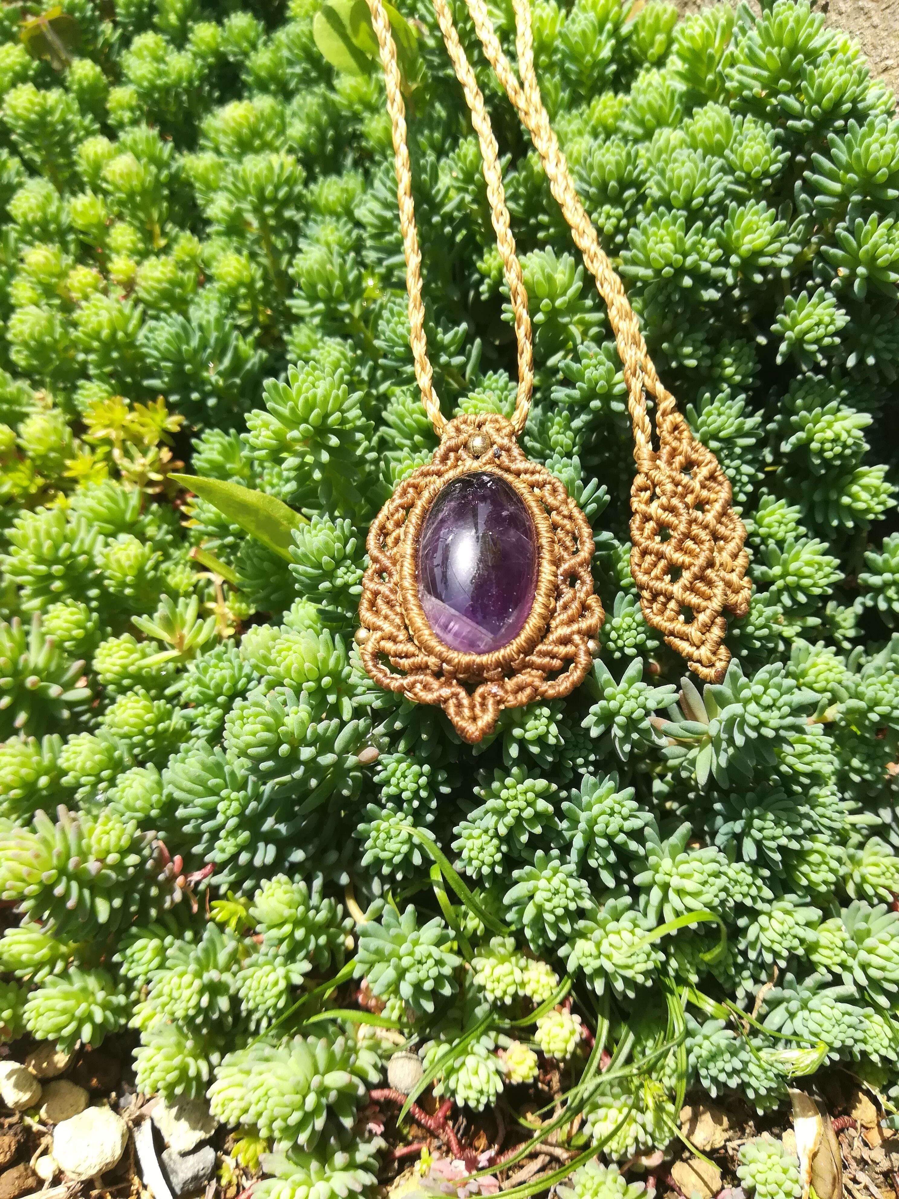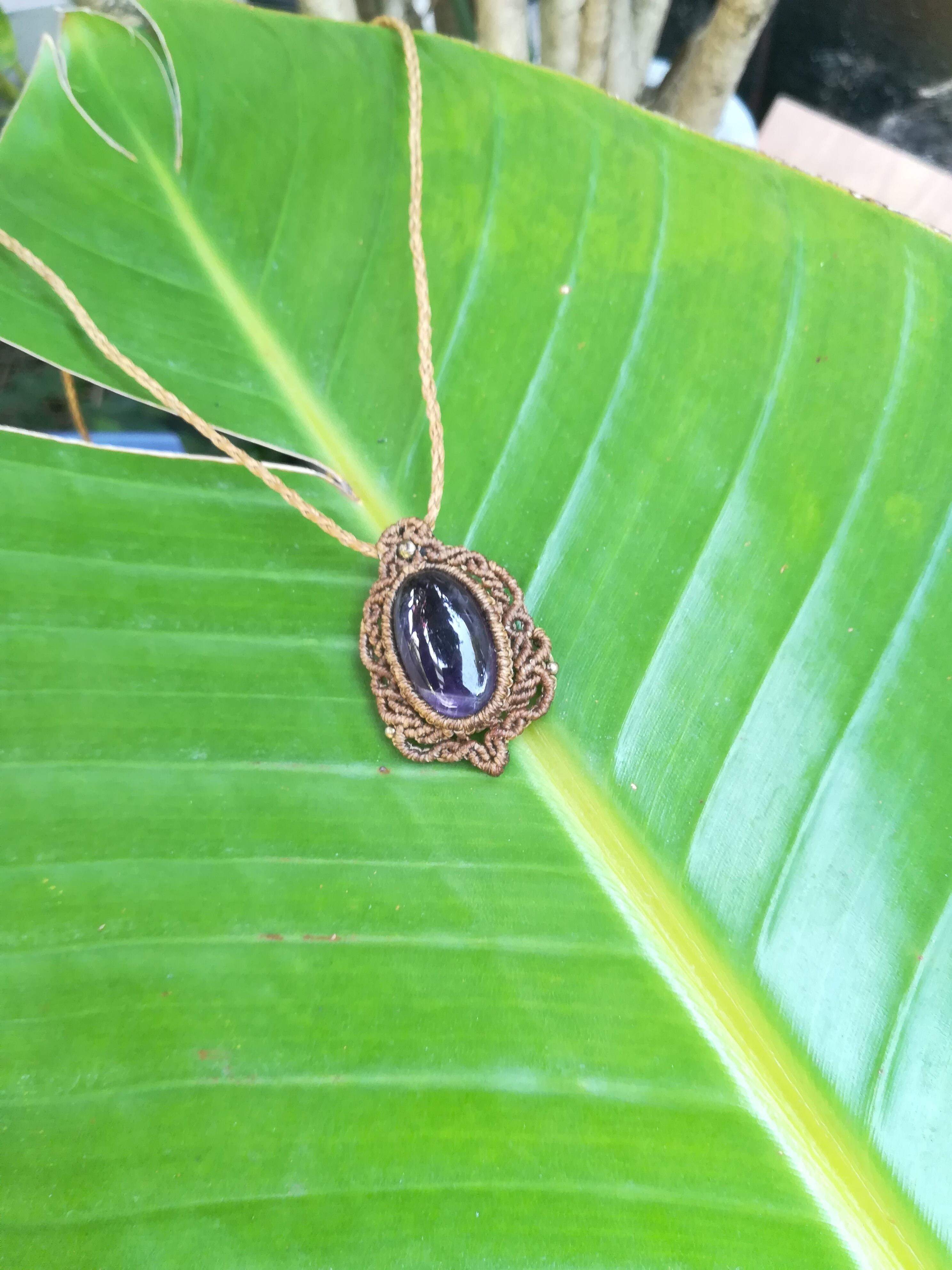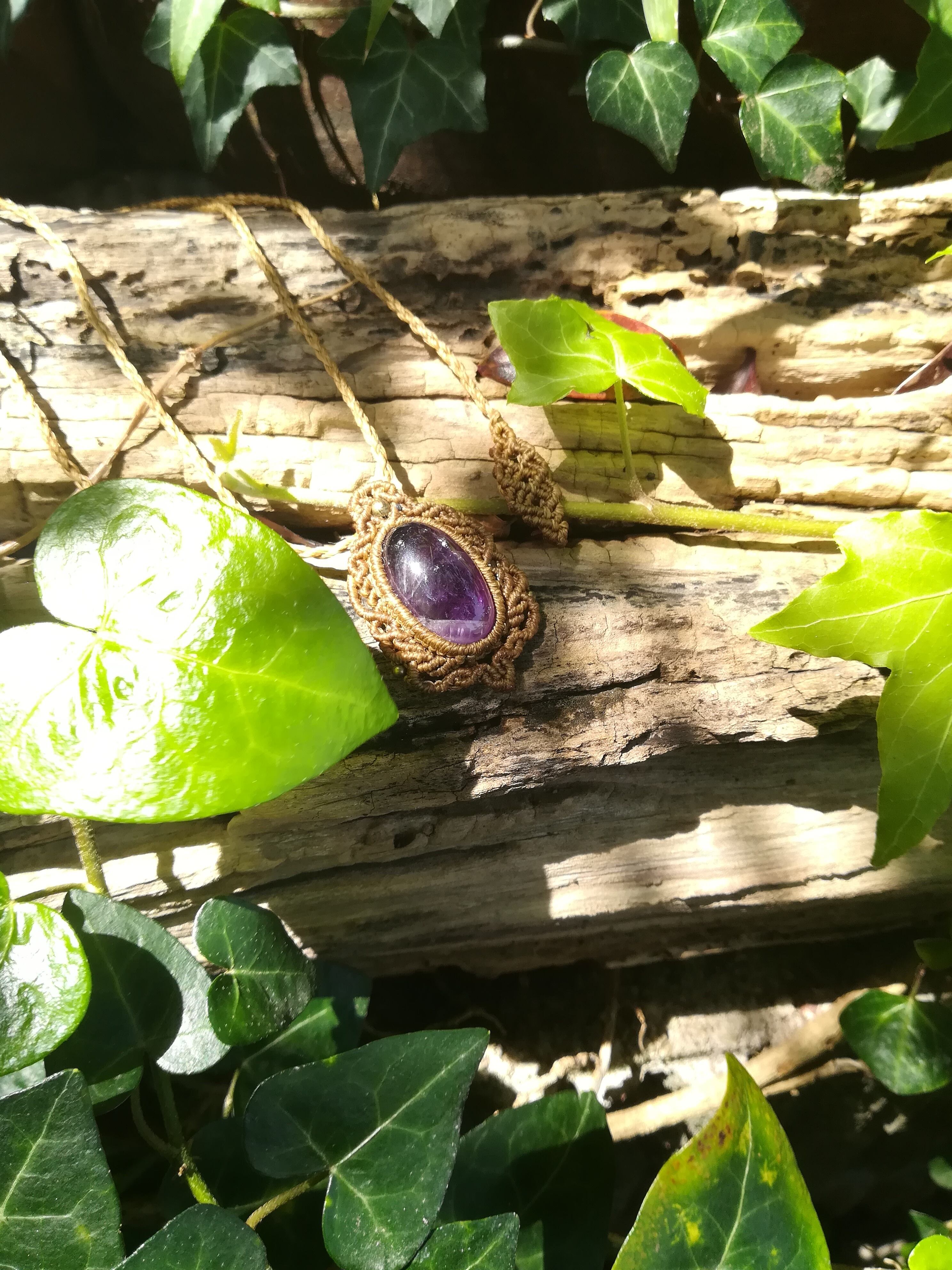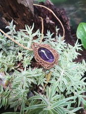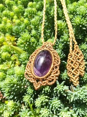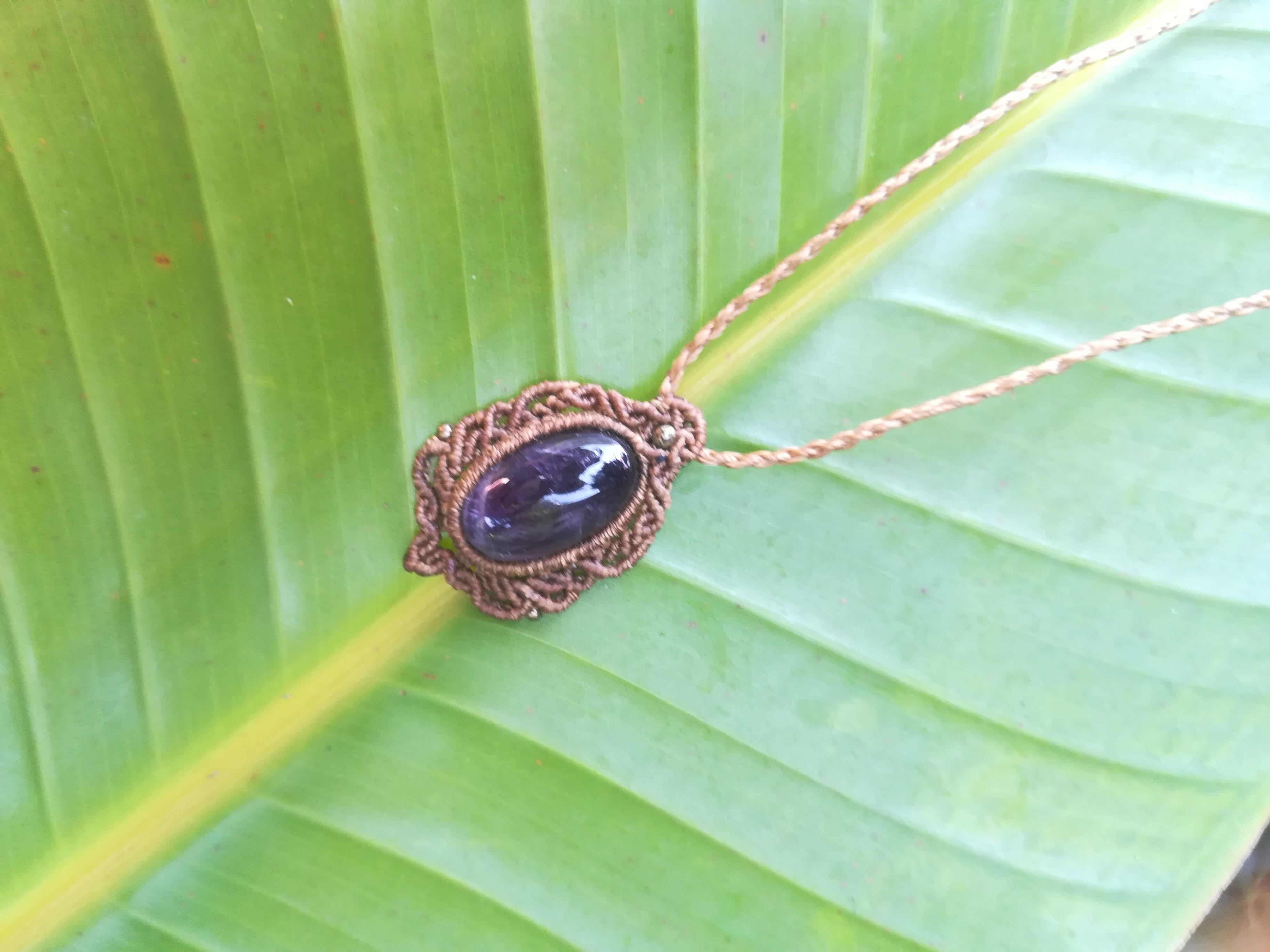 むらさきの輝きが美しいアメジストです。1年以上前に編みましたので、特別価格になります。