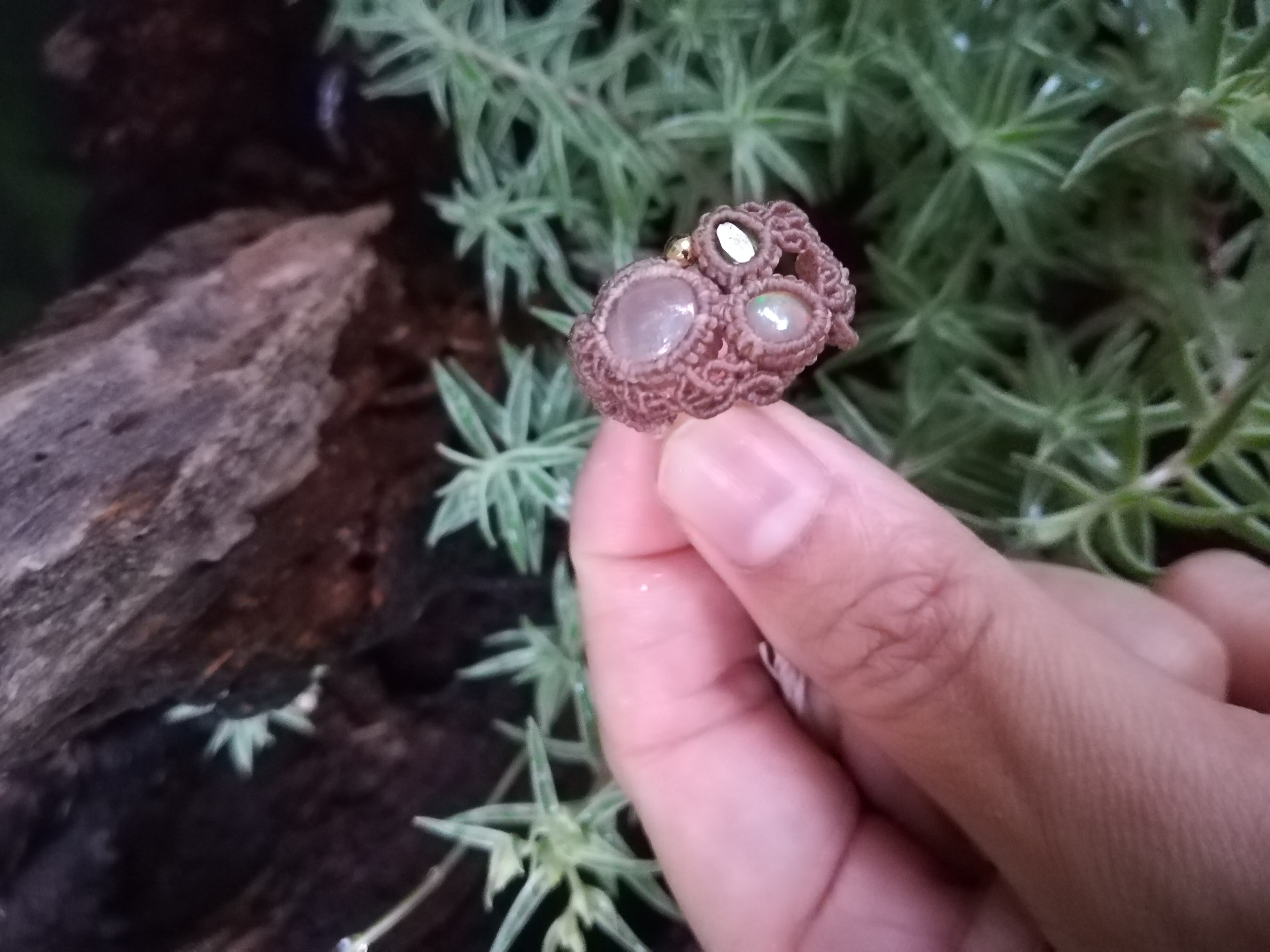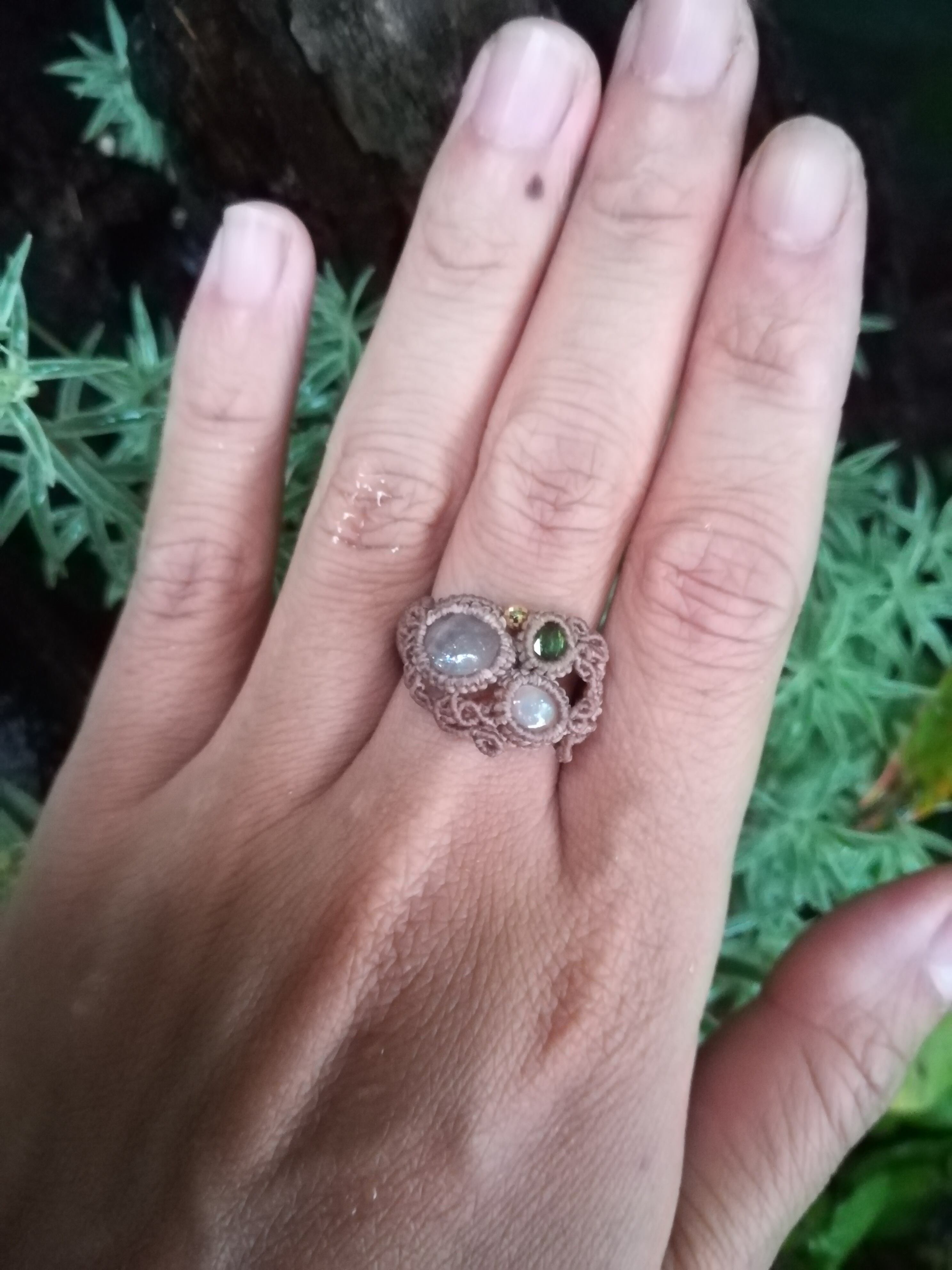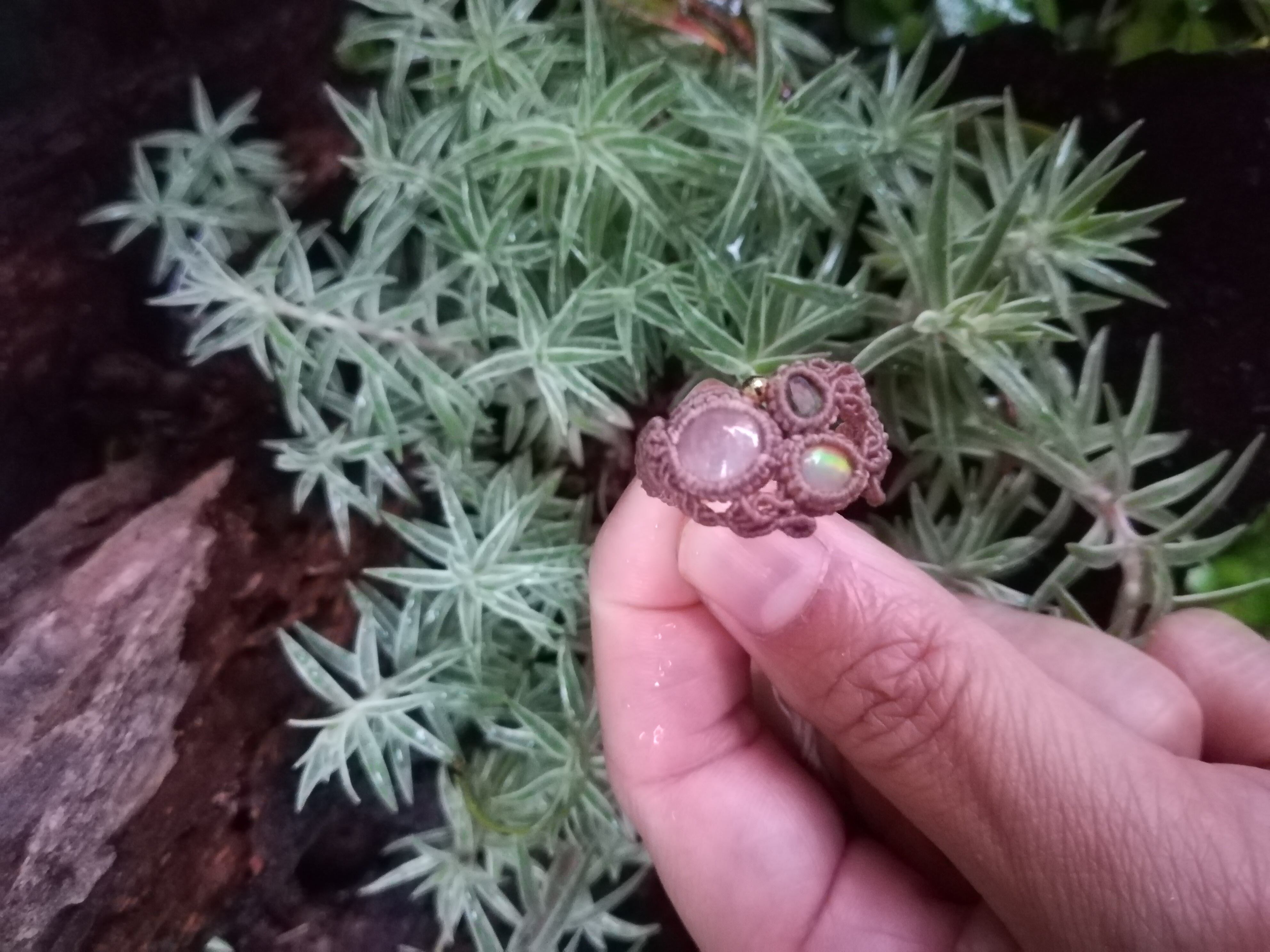 虹入りモルガナイト、グリーントルマリン、エチオピアオパール、18kのマクラメリングです。