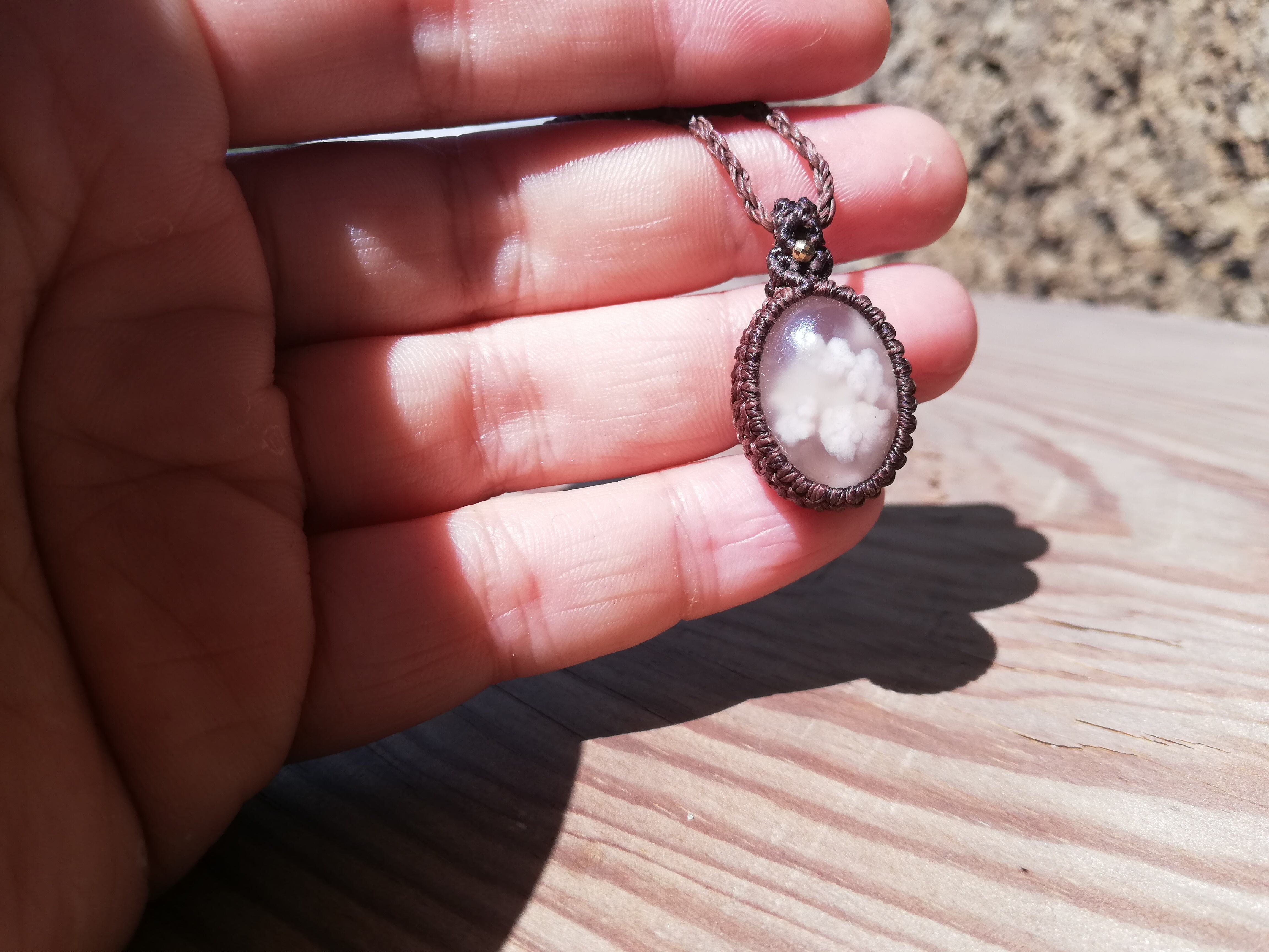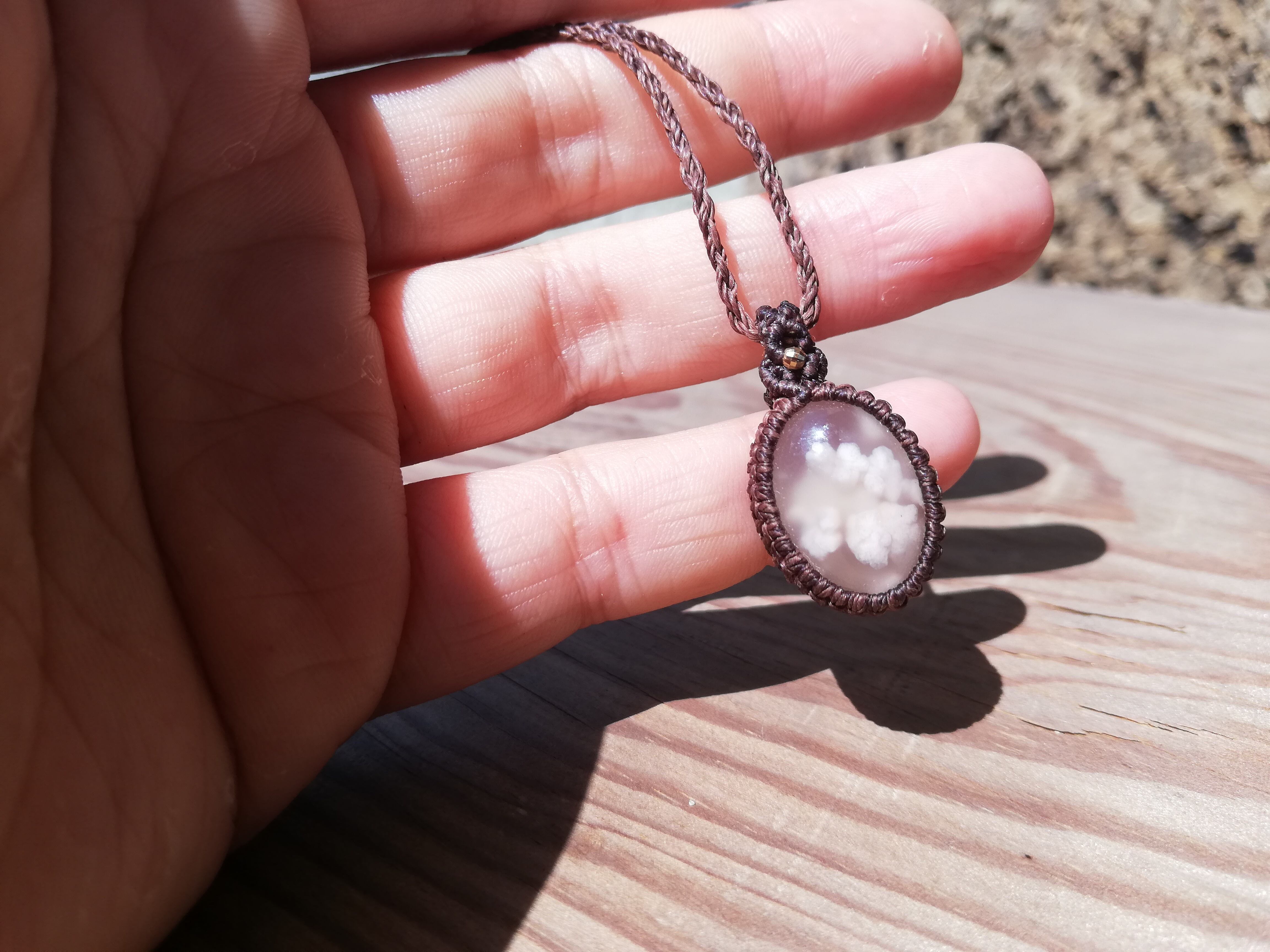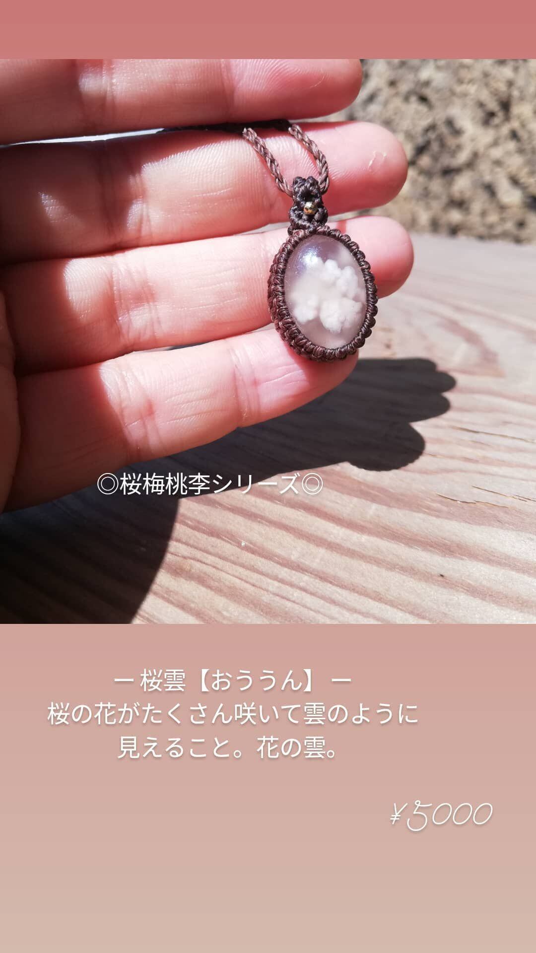 桜瑪瑙の中に桜が舞い、雲のようにふわふわと優しい模様が見られます。18kgfのビーズとダークブラウンの糸でシックにシンプルに仕上げました。