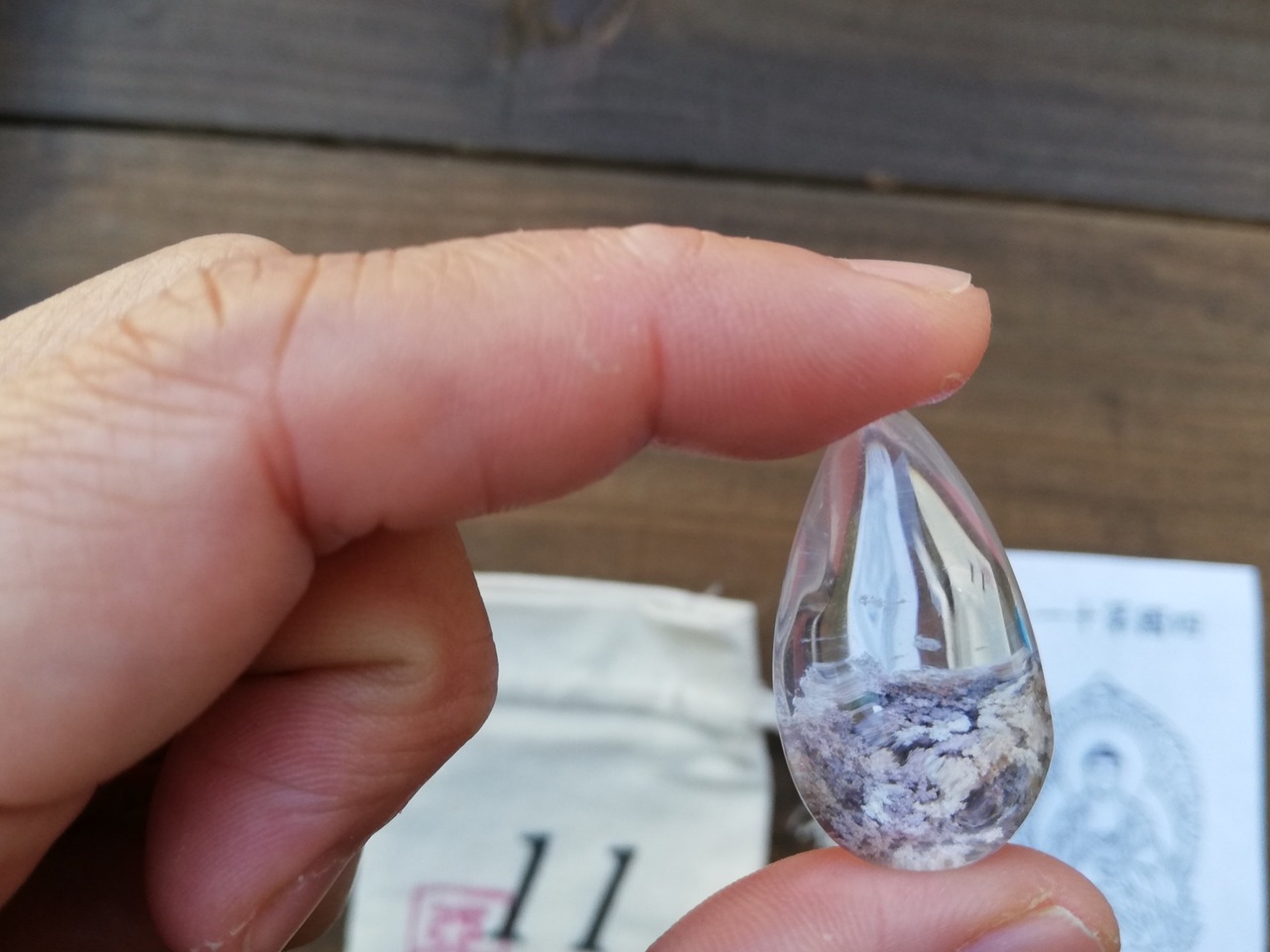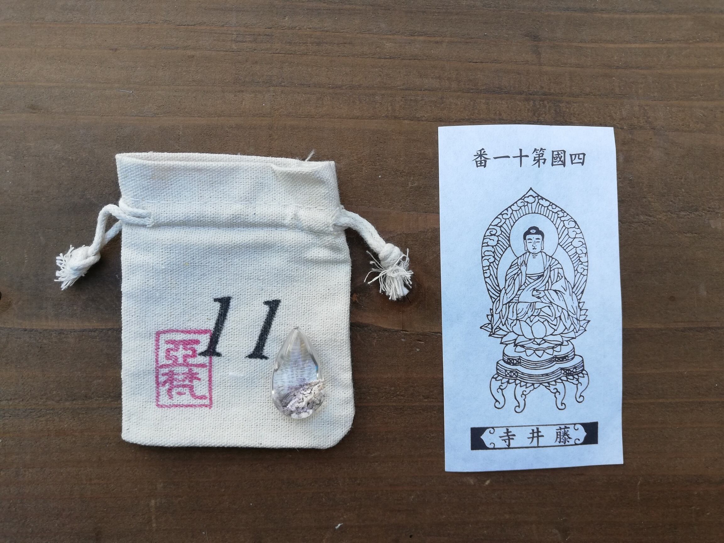ガーデンクオーツのマクラメ、札所で戴く御影、マクラメを入れる専用の番号の袋、の3点セットです。
