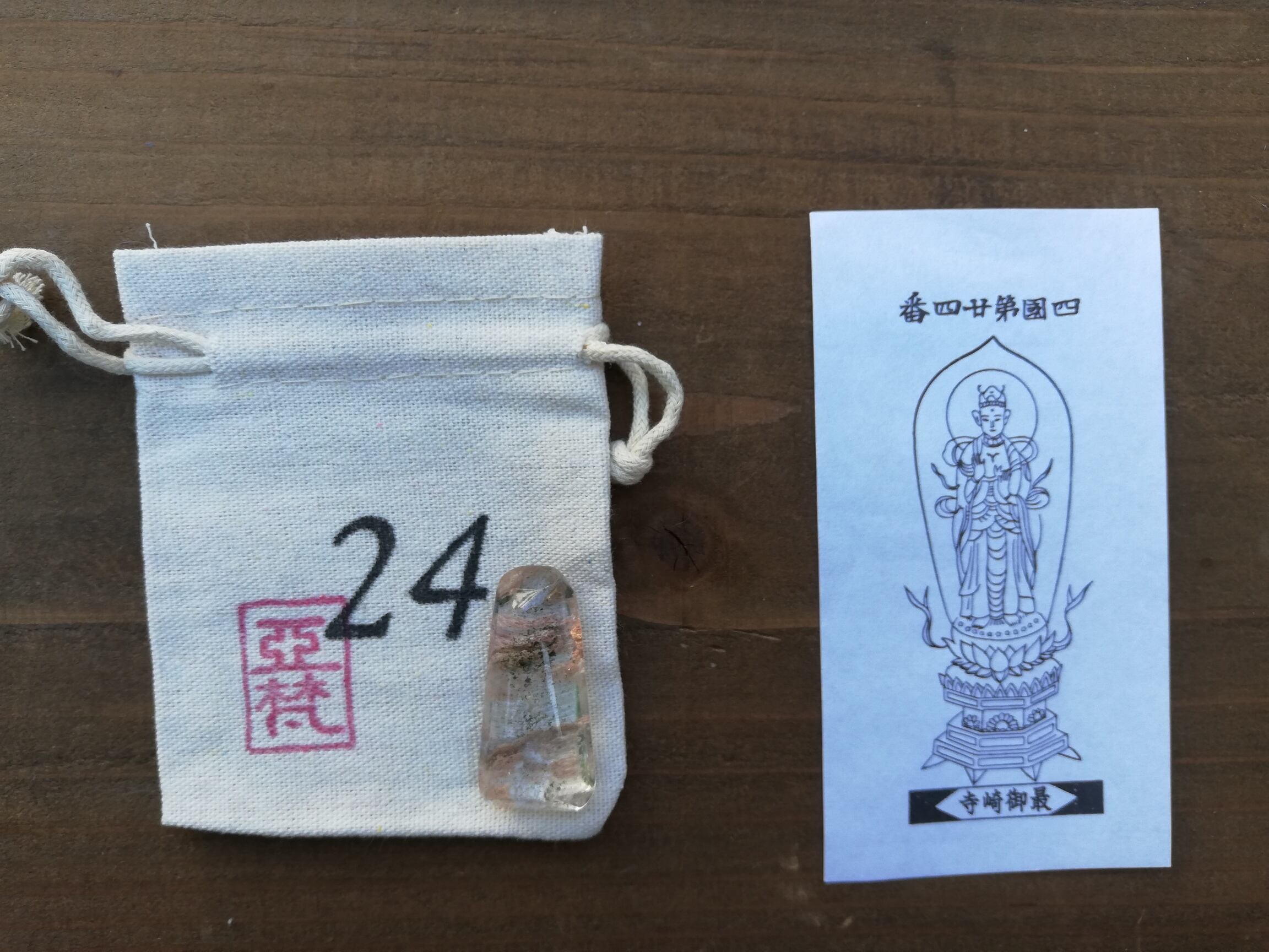 ガーデンクオーツのマクラメ、札所で戴く御影、マクラメを入れる専用の番号の袋、の3点セットです。