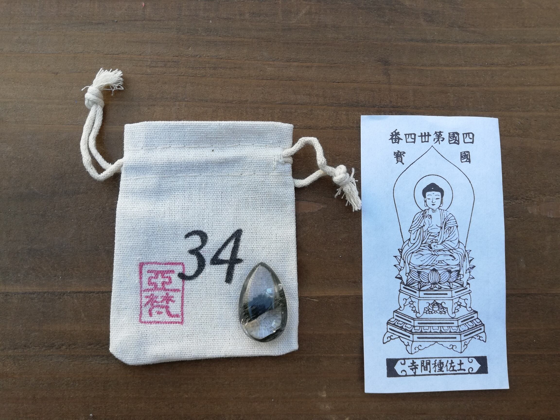 ガーデンクオーツのマクラメ、札所で戴く御影、マクラメを入れる専用の番号の袋、の3点セットです。