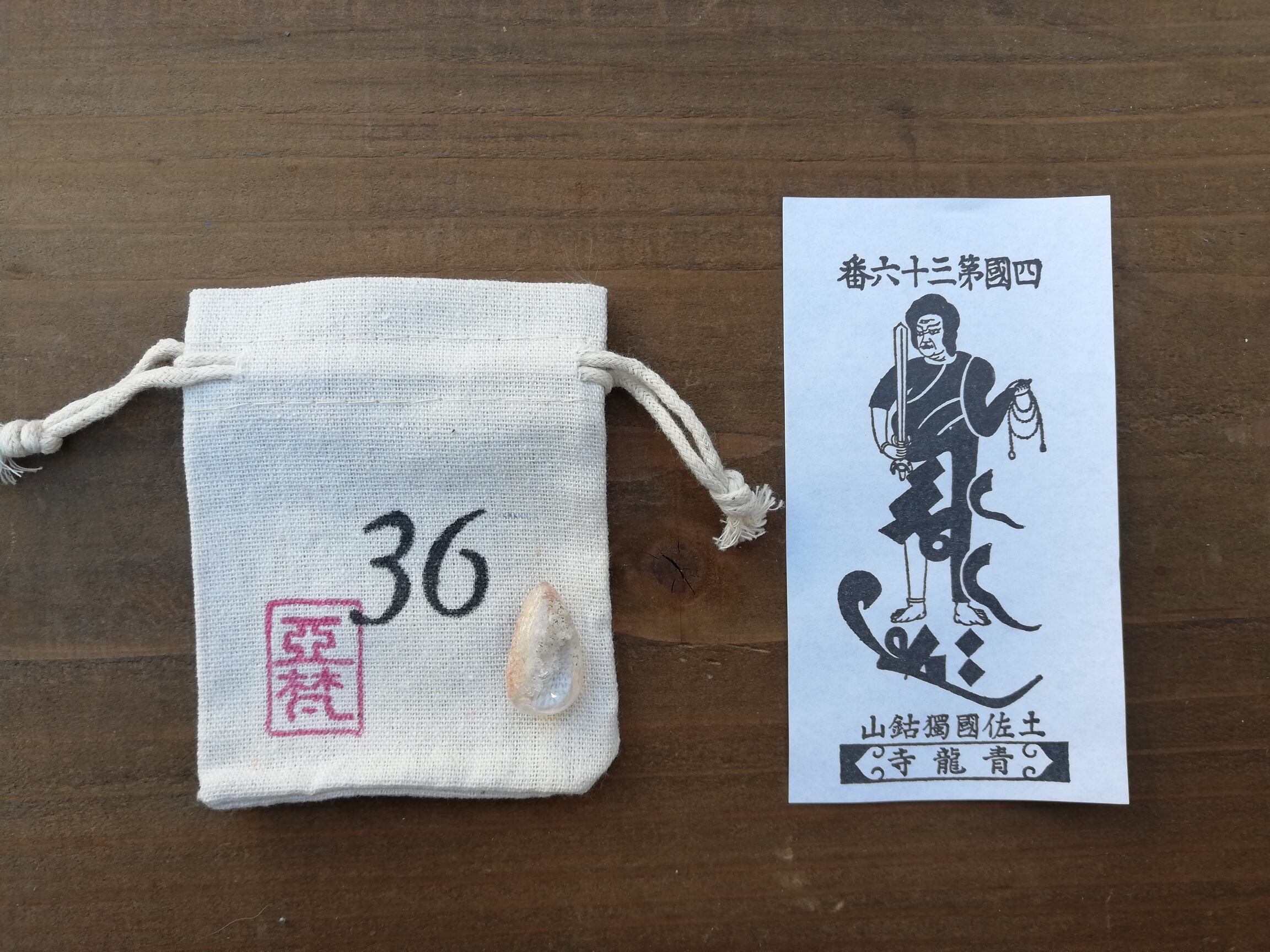 ガーデンクオーツのマクラメ、札所で戴く御影、マクラメを入れる専用の番号の袋、の3点セットです。