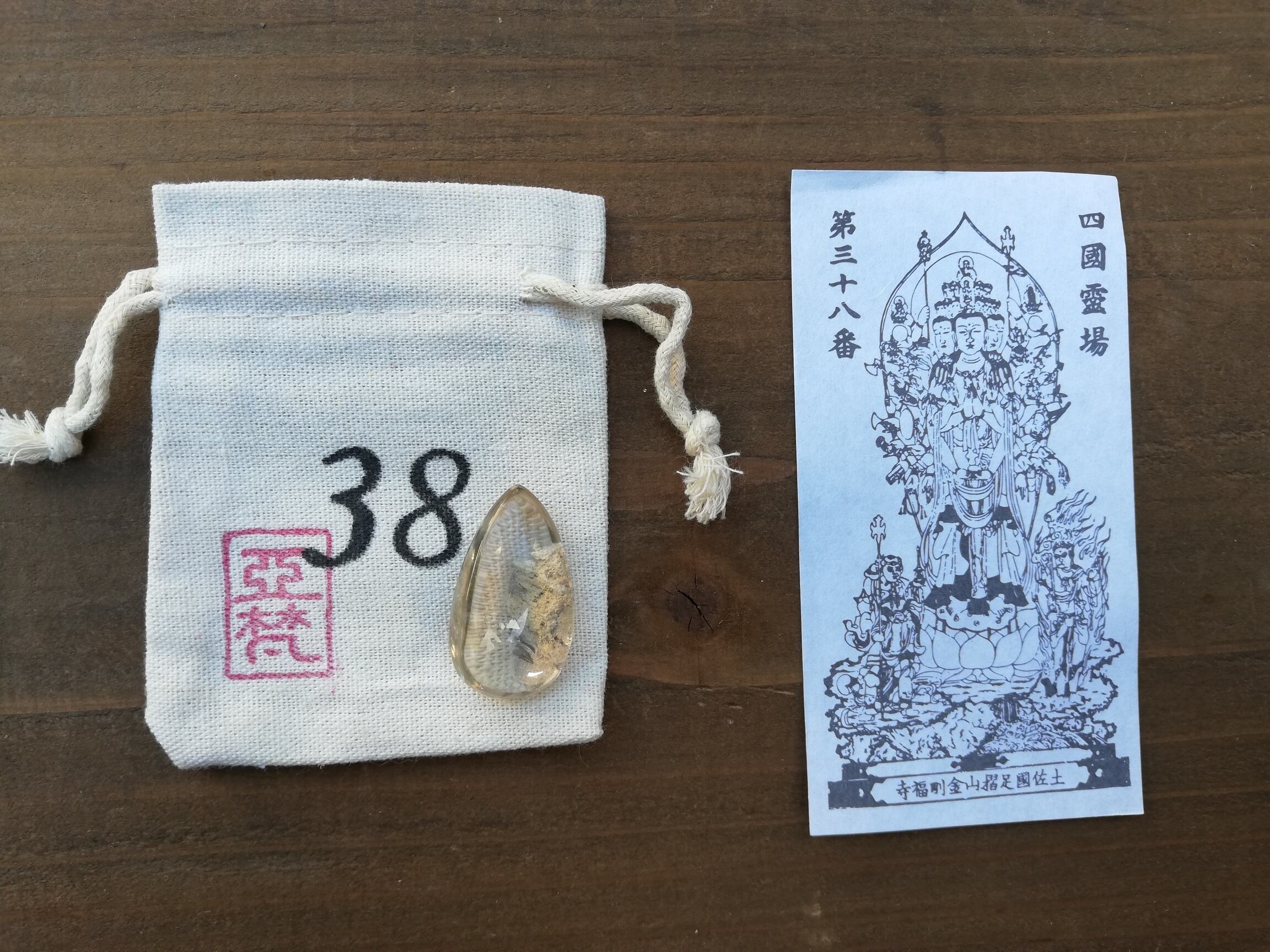 ガーデンクオーツのマクラメ、札所で戴く御影、マクラメを入れる専用の番号の袋、の3点セットです。