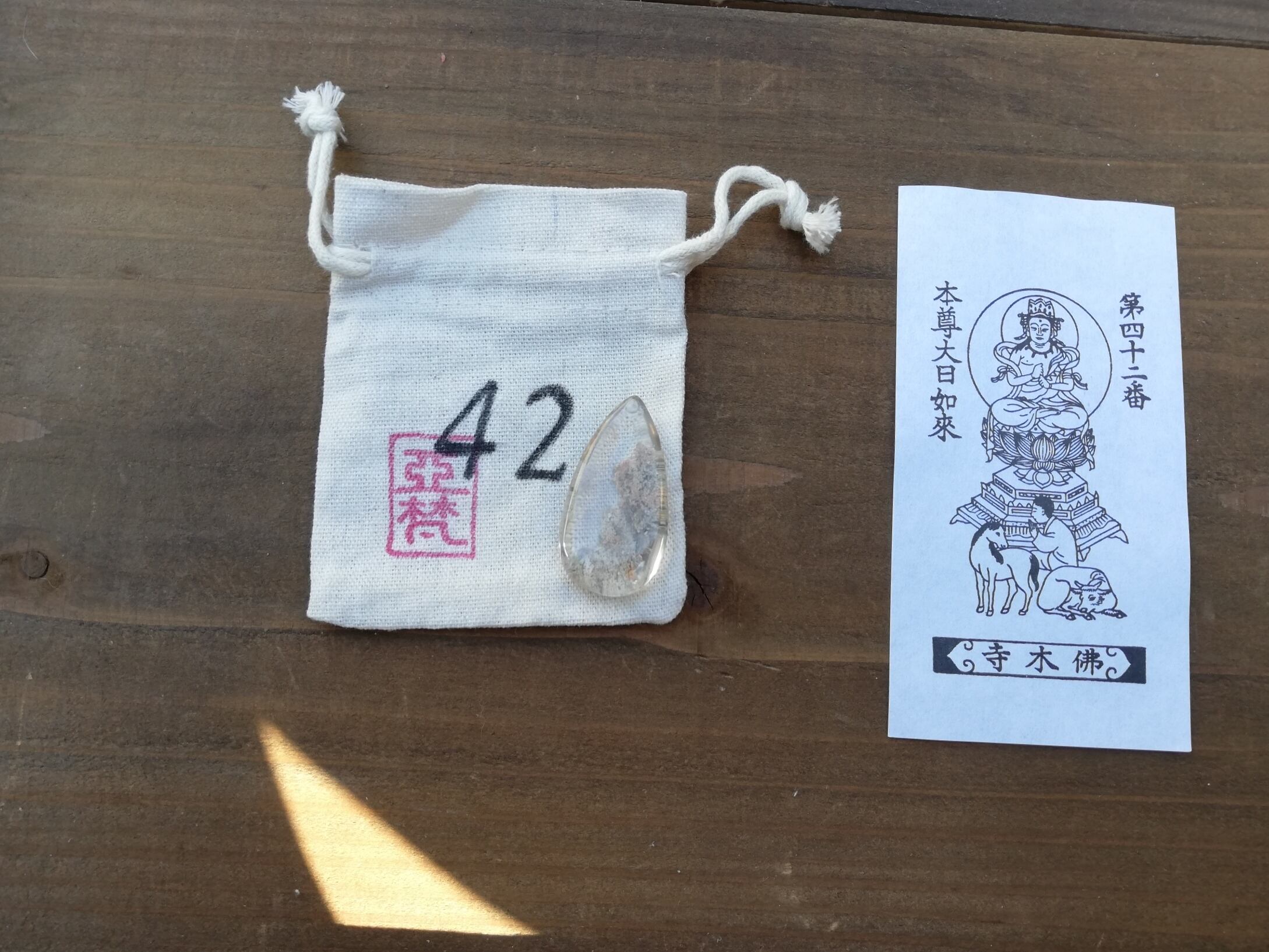 ガーデンクオーツのマクラメ、札所で戴く御影、マクラメを入れる専用の番号の袋、の3点セットです。