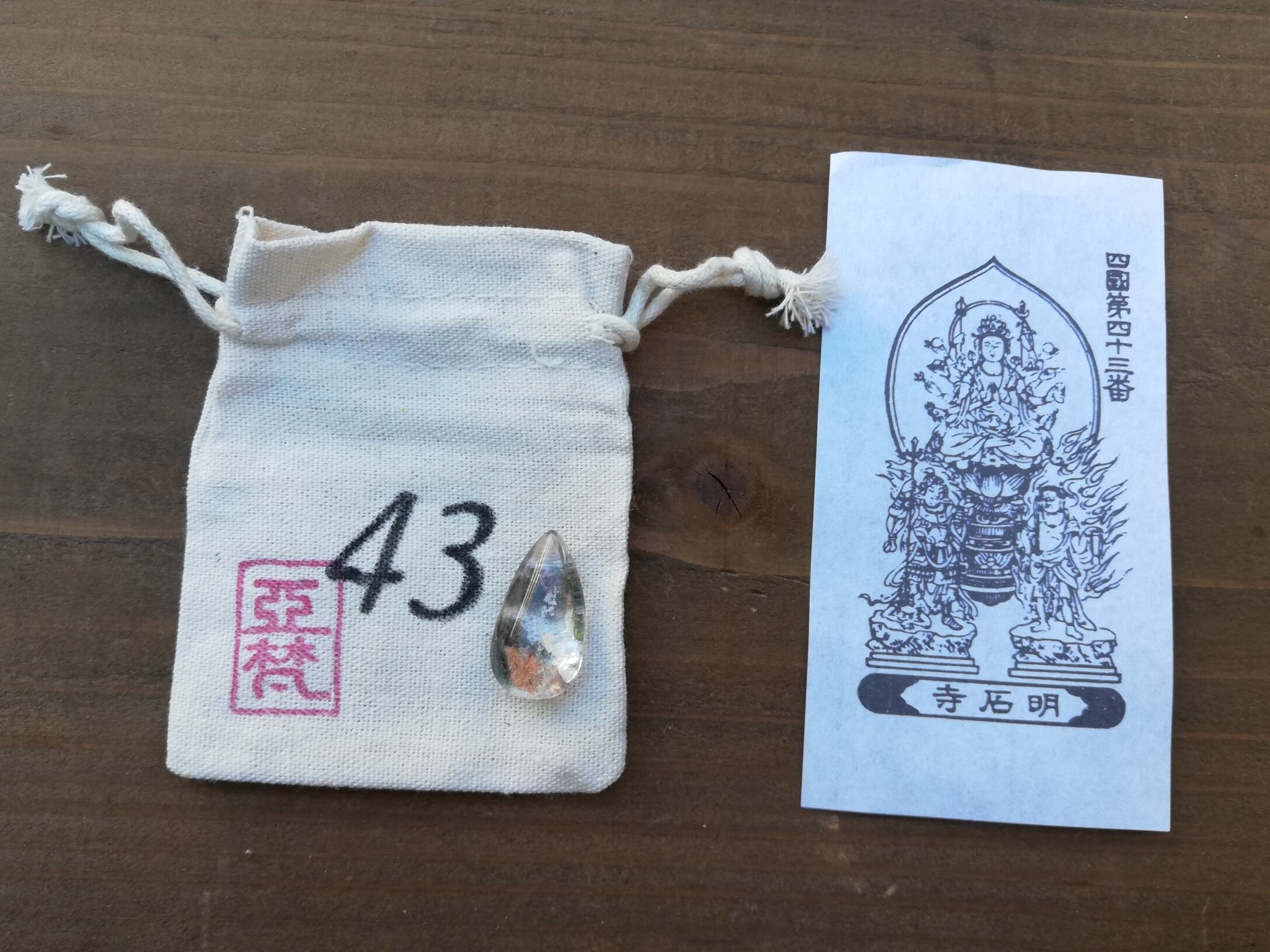 ガーデンクオーツのマクラメ、札所で戴く御影、マクラメを入れる専用の番号の袋、の3点セットです。