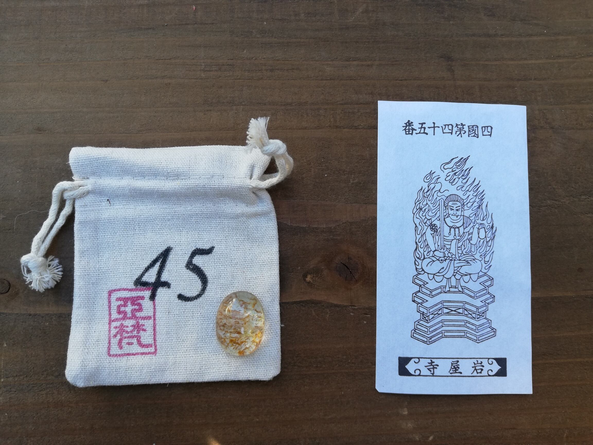 ガーデンクオーツのマクラメ、札所で戴く御影、マクラメを入れる専用の番号の袋、の3点セットです。