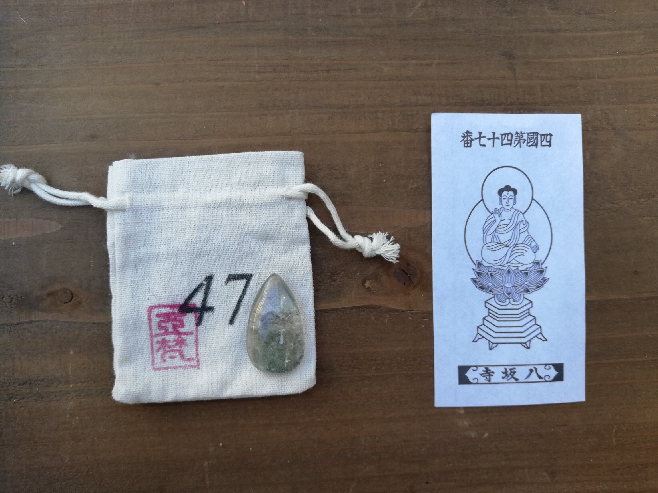 ガーデンクオーツのマクラメ、札所で戴く御影、マクラメを入れる専用の番号の袋、の3点セットです。