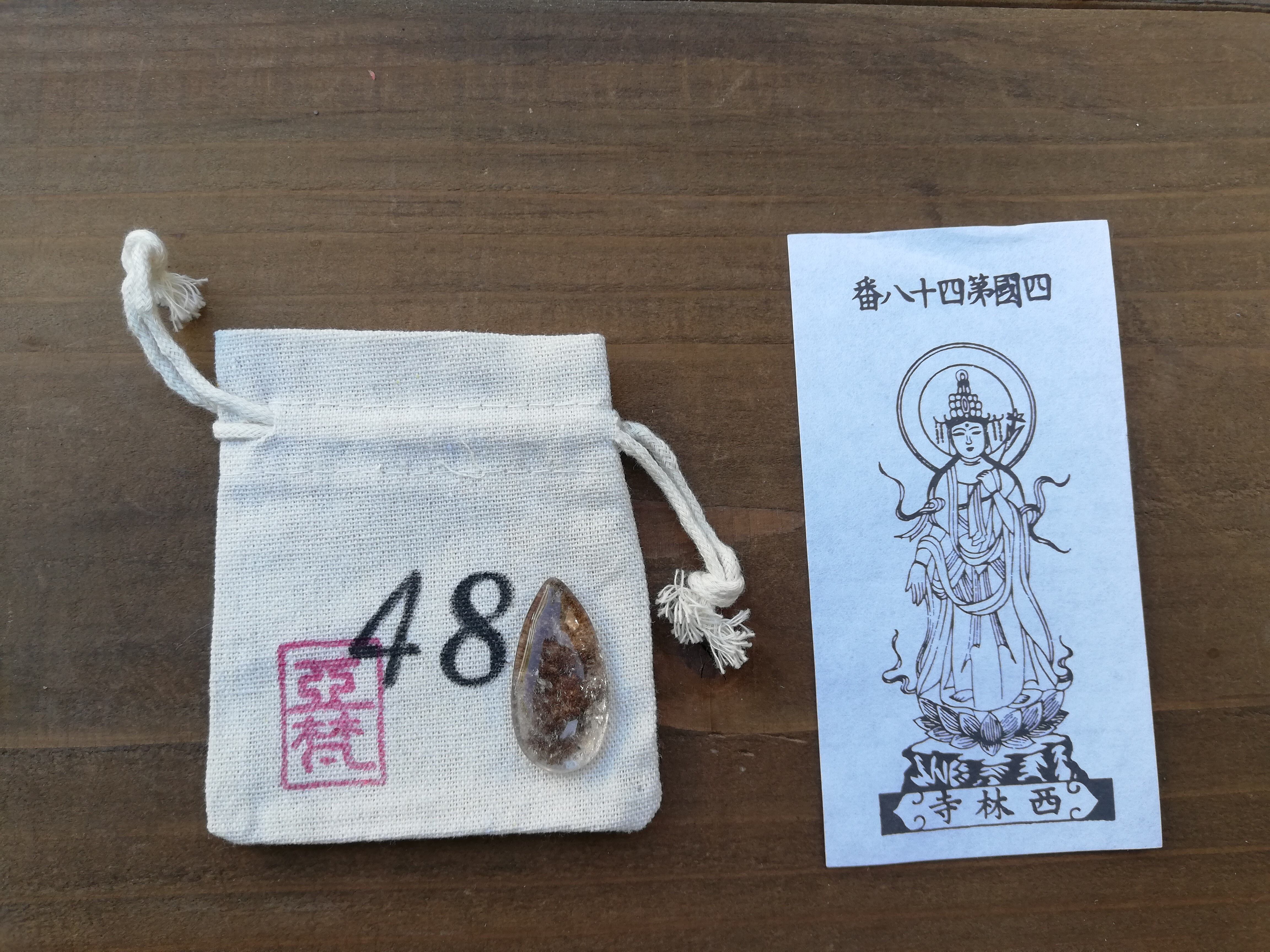 ガーデンクオーツのマクラメ、札所で戴く御影、マクラメを入れる専用の番号の袋、の3点セットです。