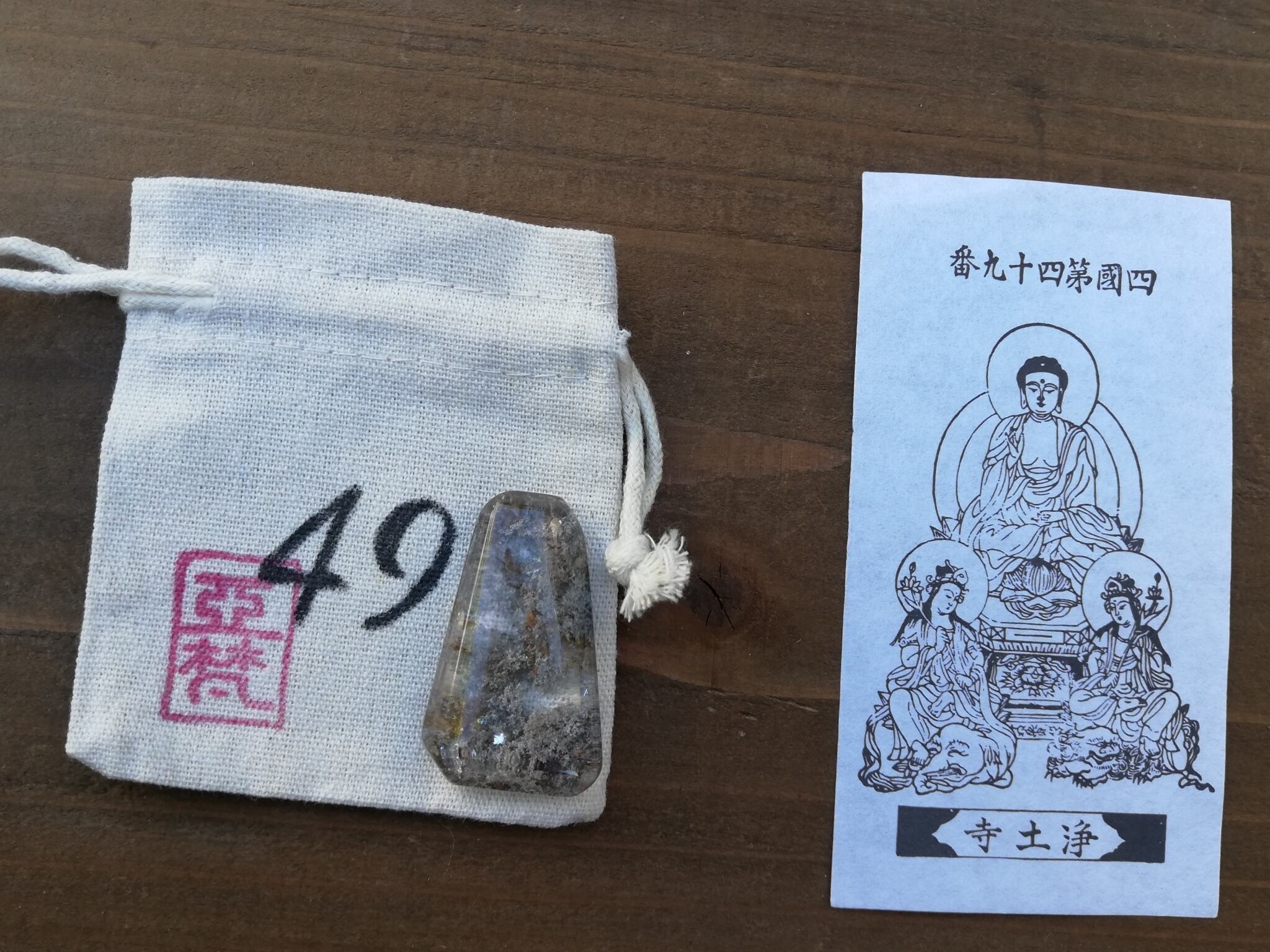 ガーデンクオーツのマクラメ、札所で戴く御影、マクラメを入れる専用の番号の袋、の3点セットです。