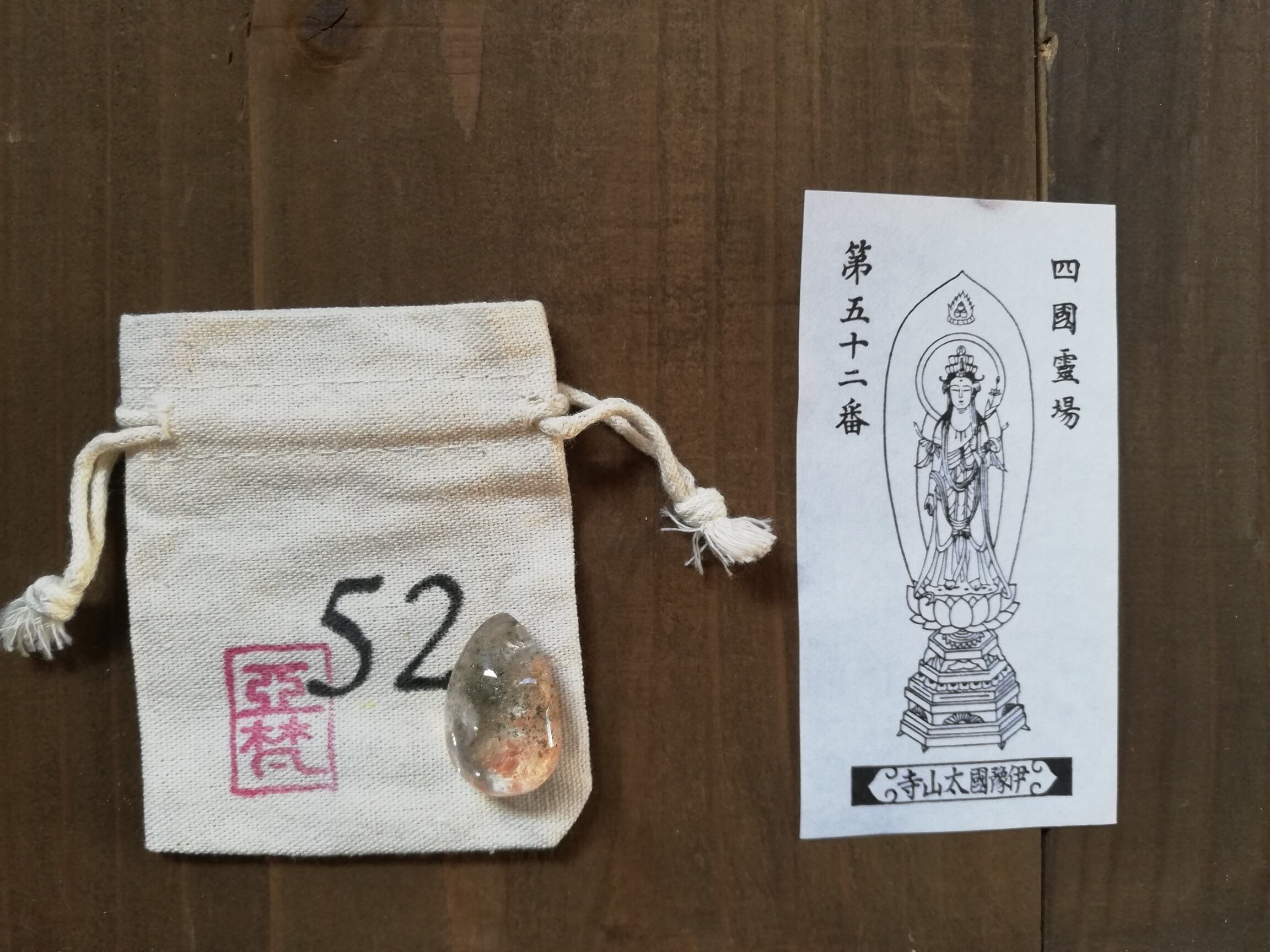 ガーデンクオーツのマクラメ、札所で戴く御影、マクラメを入れる専用の番号の袋、の3点セットです。