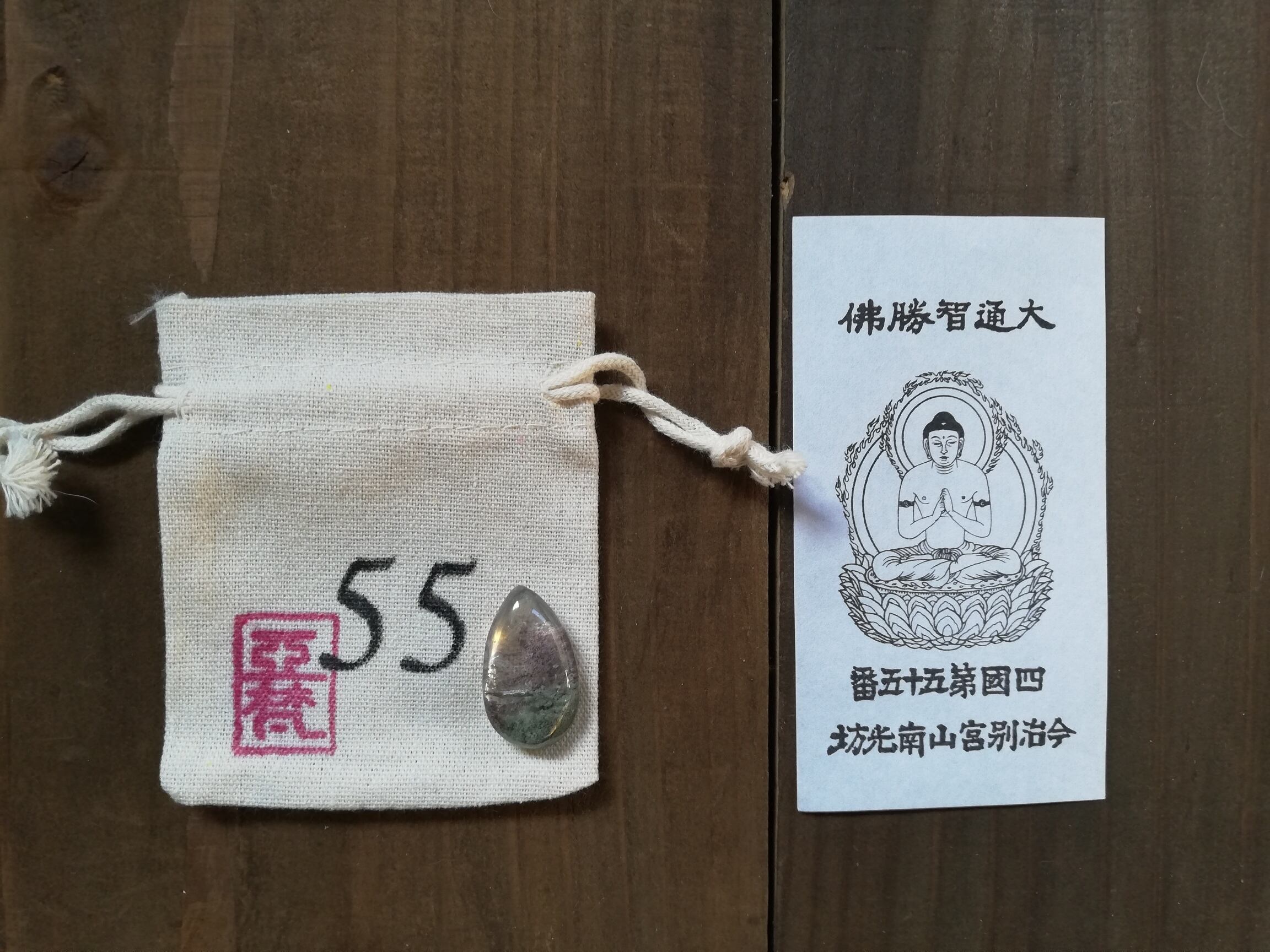 ガーデンクオーツのマクラメ、札所で戴く御影、マクラメを入れる専用の番号の袋、の3点セットです。