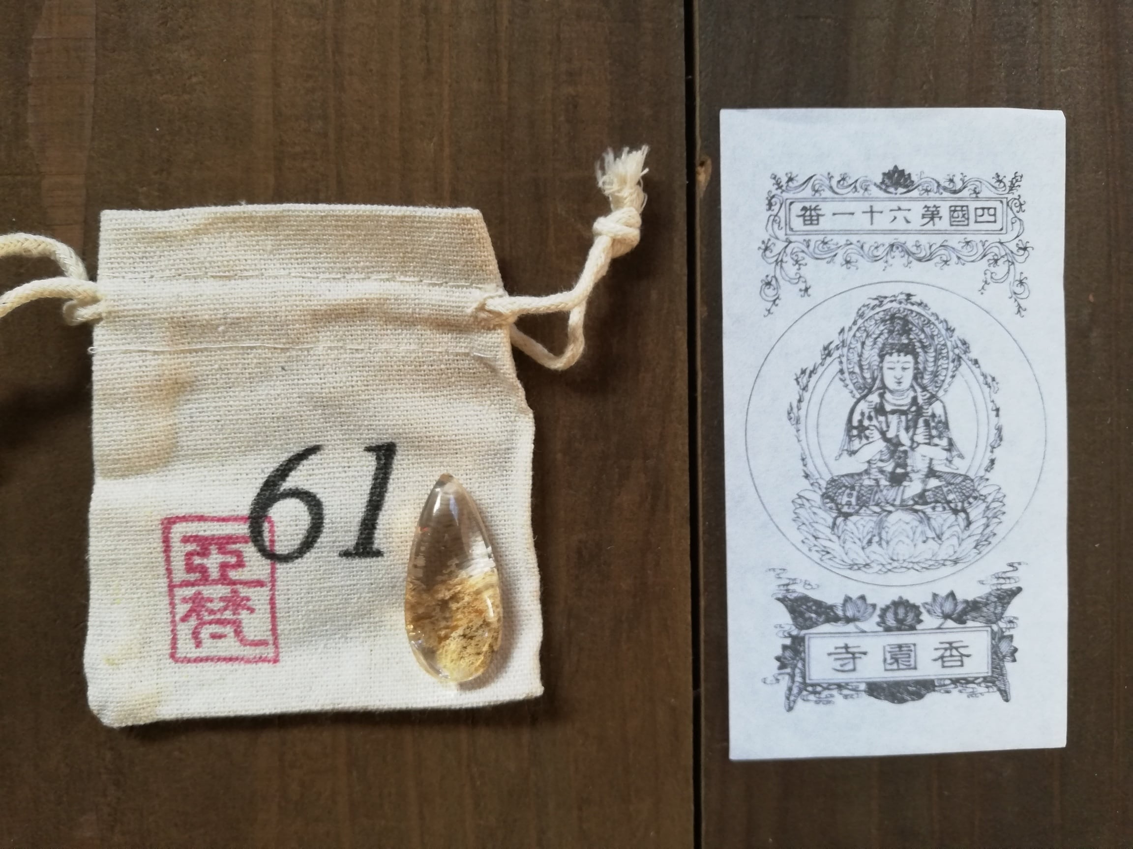 ガーデンクオーツのマクラメ、札所で戴く御影、マクラメを入れる専用の番号の袋、の3点セットです。