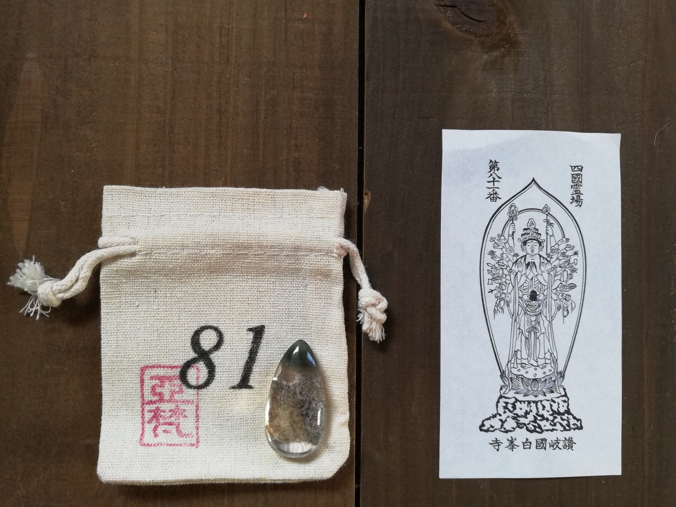 ガーデンクオーツのマクラメ、札所で戴く御影、マクラメを入れる専用の番号の袋、の3点セットです。