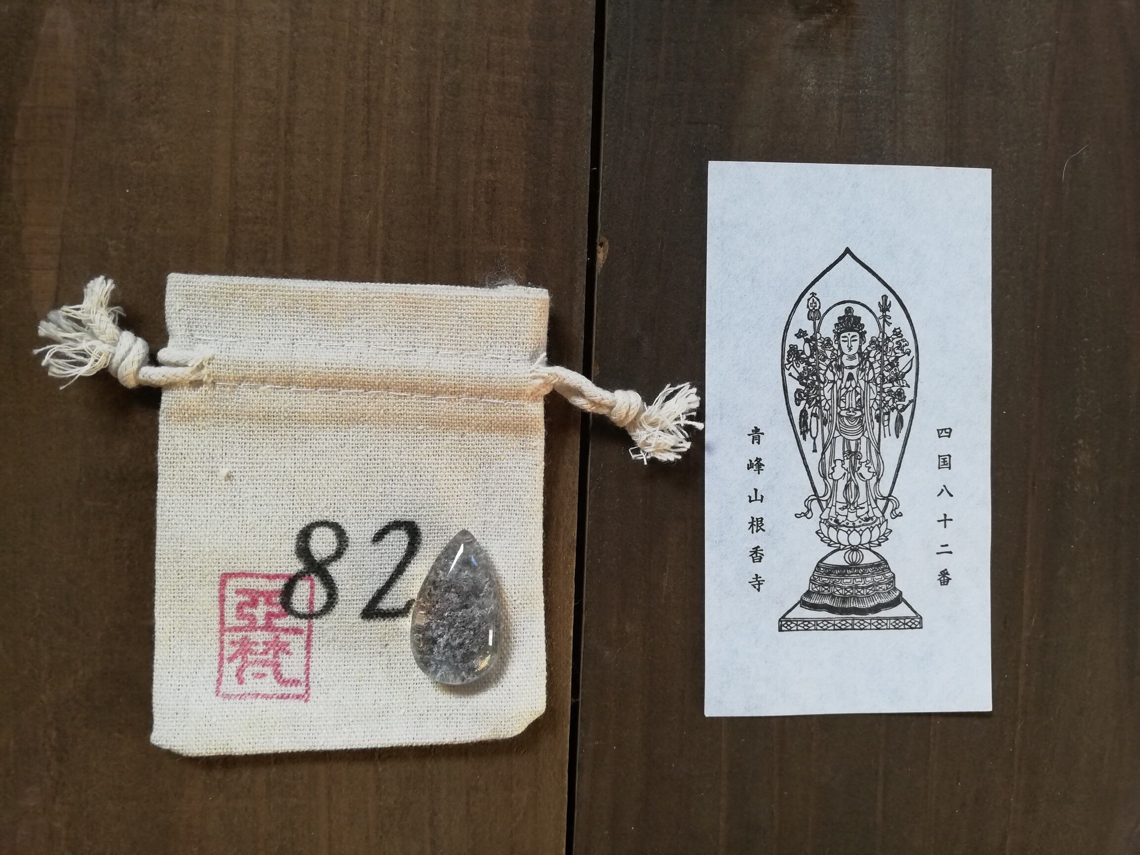 ガーデンクオーツのマクラメ、札所で戴く御影、マクラメを入れる専用の番号の袋、の3点セットです。