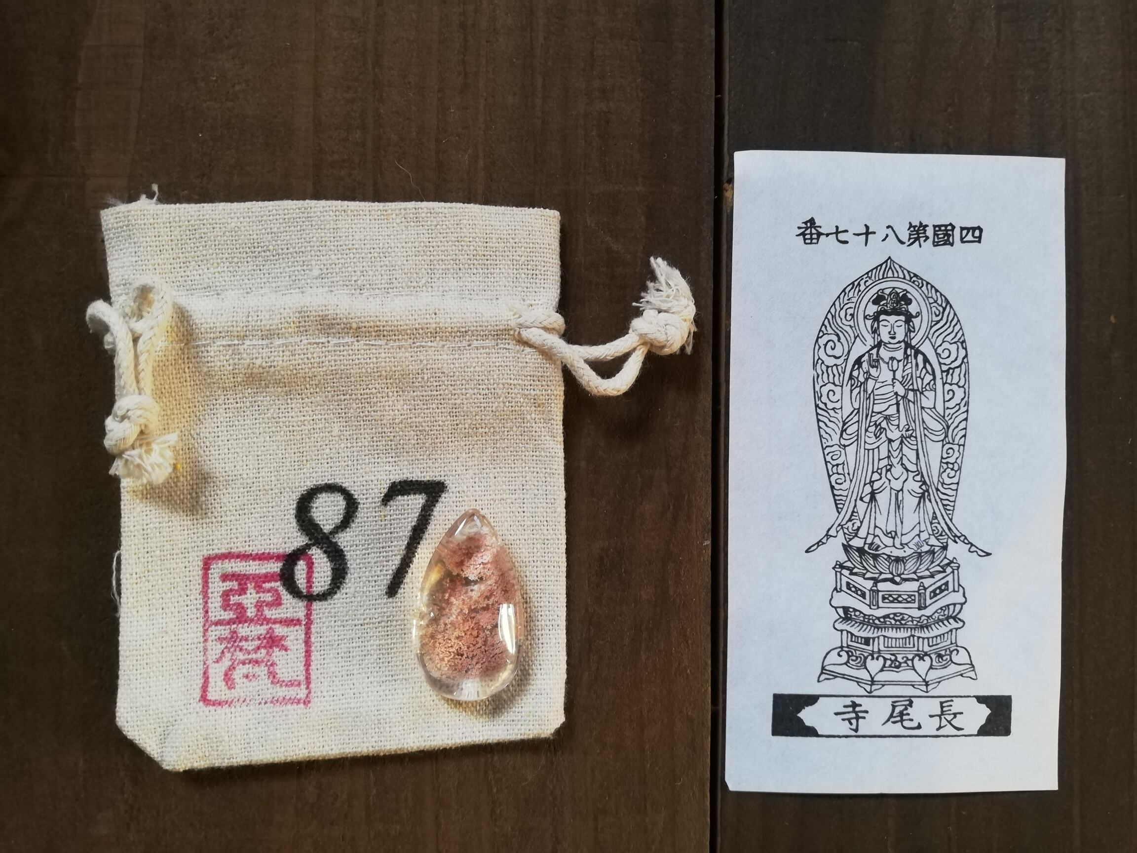 ガーデンクオーツのマクラメ、札所で戴く御影、マクラメを入れる専用の番号の袋、の3点セットです。